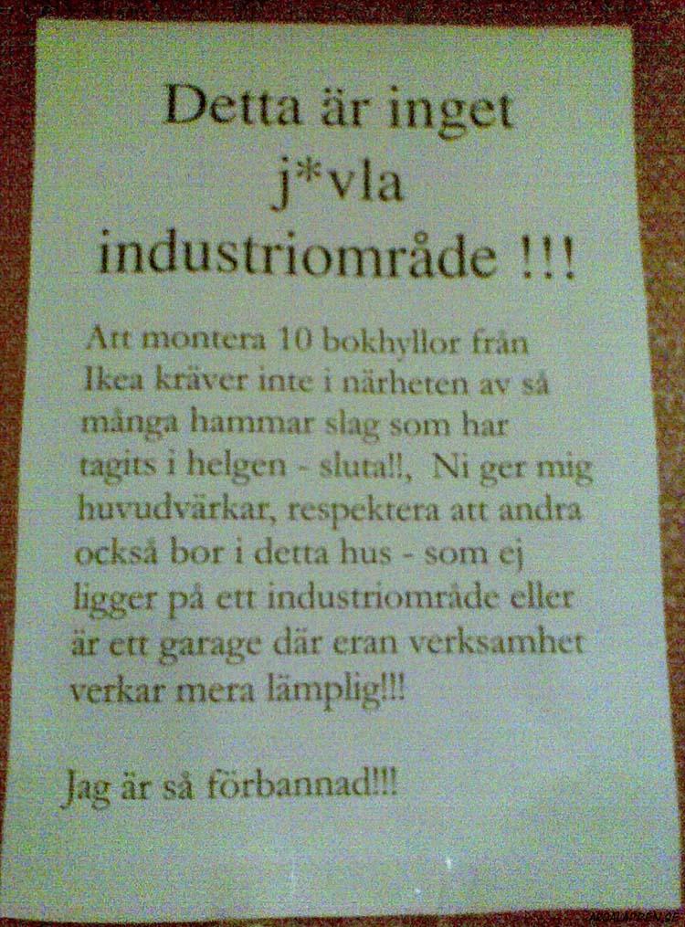 ![]() | Det är lätt att drabbas av panikkänslor när grannen drar igång 01.30. Vet ju inte heller om man vågar gå upp o knacka på, det kan ju vara några troll som bor där och som man inte vill förhandla med mitt i natten iklädd pyamas och fårskinnstofflor. | |
